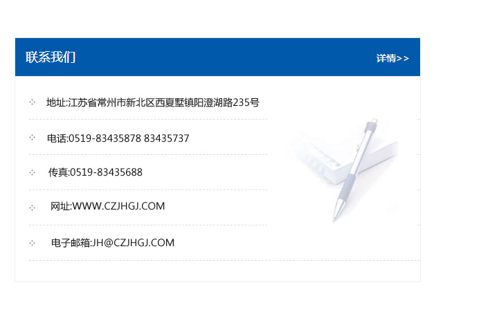 地址:常州市新北區友邦商務大廈1幢16、17層  電話:0519-85101652  傳真:0519-85112595  郵編:213022  網址:www_cz-jiayue_cn.xdo-china.com  郵箱:xiajifengaa@163.com